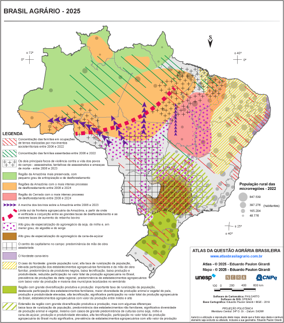 O processo de construção do mapa e a explicação/análise das principais estruturas e dinâmicas regionais do campo brasileiro estão no artigo "GIRARDI, E. P. Uma versão atualizada do mapa “Brasil Agrário”. Revista NERA, v. 28, n. 3, p. 1-24, 2025." Clique aqui para acessar o artigo na Revista NERA.